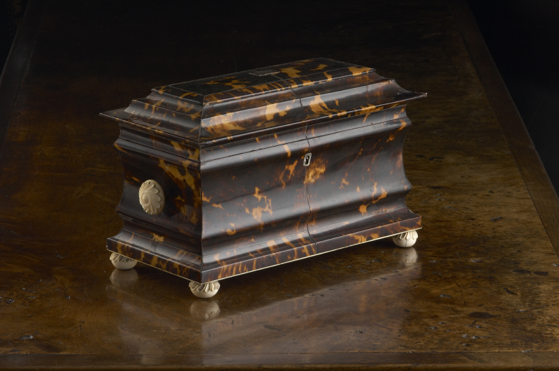 the carnet moulded hinged lid enclosing a twin ‘lidded’ interior with central cut glass bowl, with ivory paterae bun side handles and conforming feet