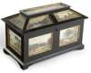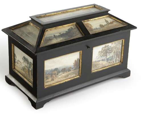 the cavetto hinged top, front, sides and back comprising of small glazed watercolours of landscapes with a lined interior and bracket feet, underside bears makers label, ‘J.P White, Cabinet Manufactory, College Hill, Shrewsbury’