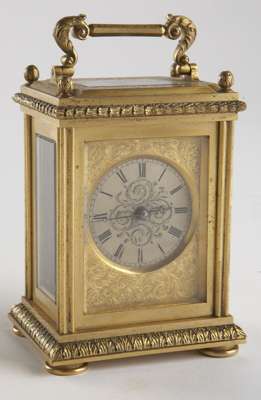 the silvered dial within a foliate chased case with scroll handle and squat bun feet