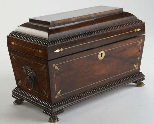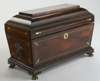 of sarcophagus form, the bead moulded hinged lid opening the to reveal a fitted interior raised on four carved giltwood claw feet