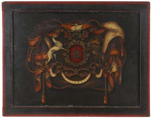 within original frame, the painted coat of arms with the motto ‘DURUM PATIENTIA FRANGO’, with a lion and greyhound holding a central shield