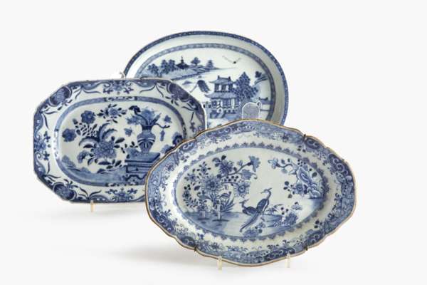 decorated with figures and pagoda within a riverside landscape, 32.5cm across; together with a small 18th century Chinese blue and white oval dish and an octagonal dish (3)