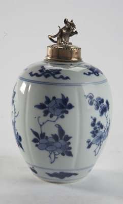 the lobed ovoid sides, the panelled sides decorated in underglaze blue with fruit and flowers, the cover with a mouse finial