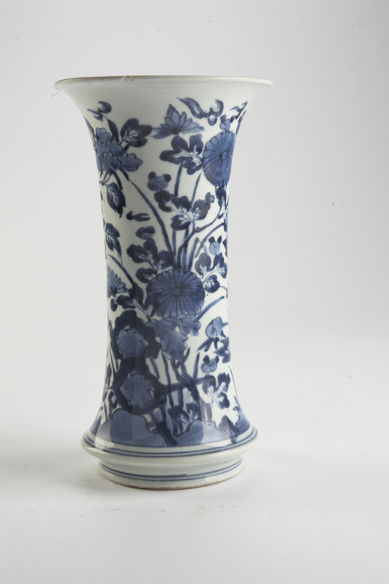 the reeded ovoid sides decorated with reserves depicting foliage and vessels, the domed cover surmounted by a rodent finial, 24.5cm high; together with a Chinese blue and white flared vase, 31cm high (2)