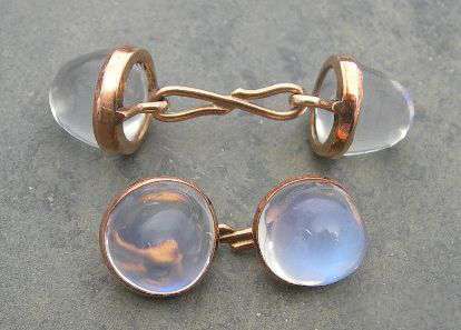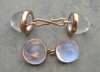 each circular terminal collet set with a high-domed moonstone cabochon, conjoined by a slim S-scroll link