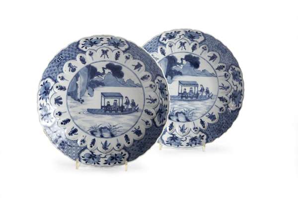 the lobed sides decorated with figures on a junk within a stylised foliate and geometric panelled border (2)