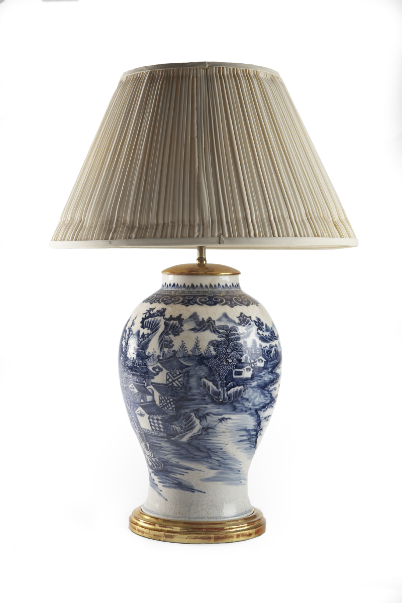 the baluster sides decorated with a pagoda within a coastal mountainous landscape, converted into a lamp
