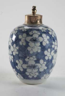 A Chinese blue and white porcelain and silver mounted tea caddy