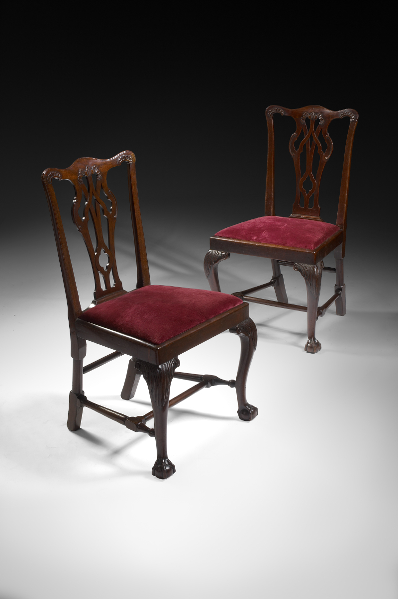 possibly Scottish, the interlaced vase shaped splats over drop in seats raised on acanthus carved cabriole legs united by H-shape stretchers and ending in claw and ball feet (2)