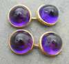 each circular terminal collet set with a high-domed amethyst cabochon, with scroll and bead borders to the mounts, conjoined by a bar, stamped 18K