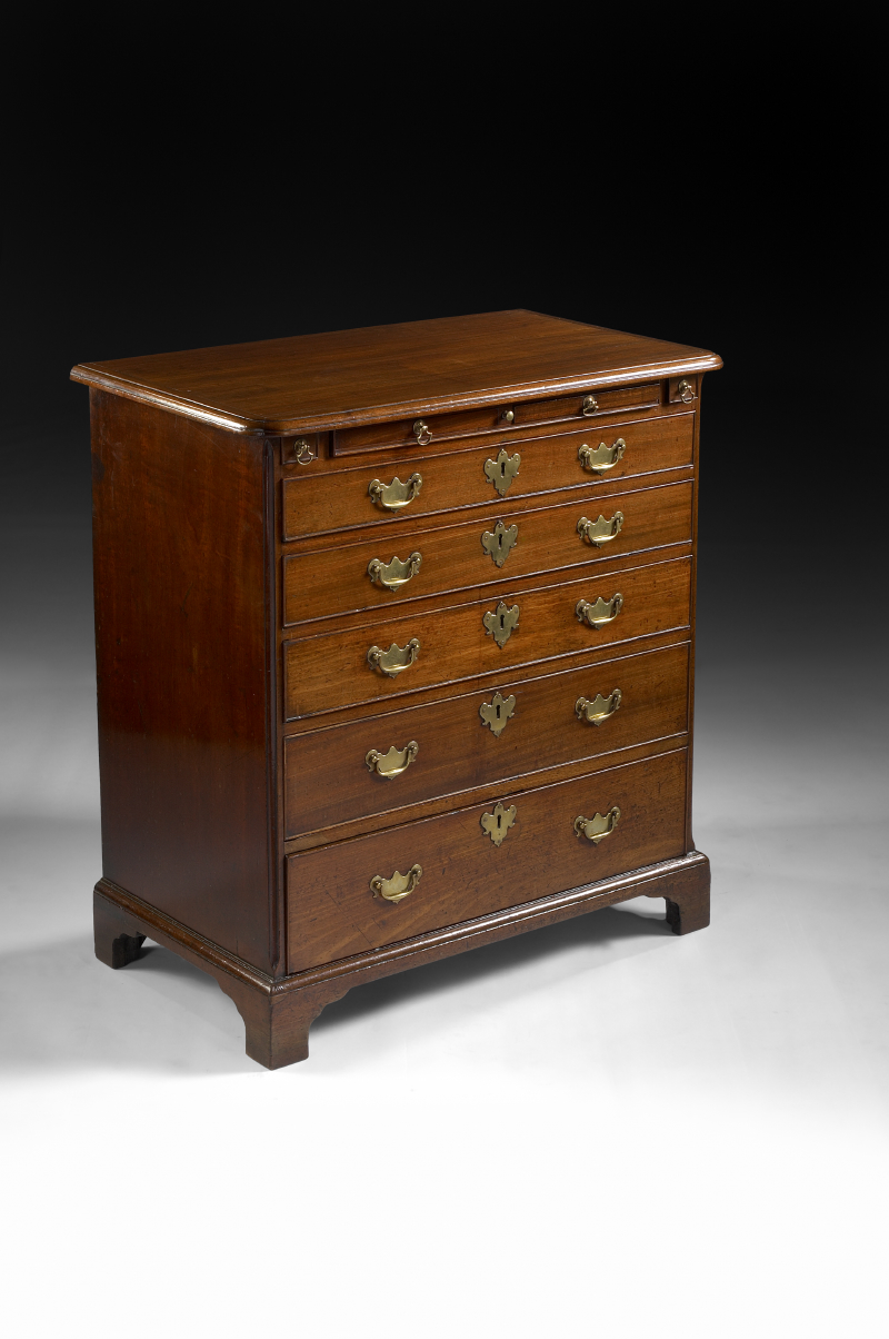 the moulded top with rounded corners above a central pull-out leather inset slide incorporating two narrow drawers, flanked by two small outer drawers, below are five long graduated drawers, raised on bracket feet