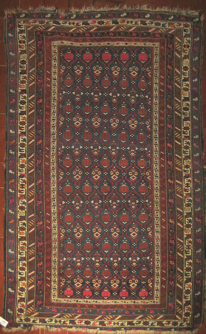 the indigo field with allover stylised vine and floral lattice, within multiple polychrome borders 198cm x 126cm