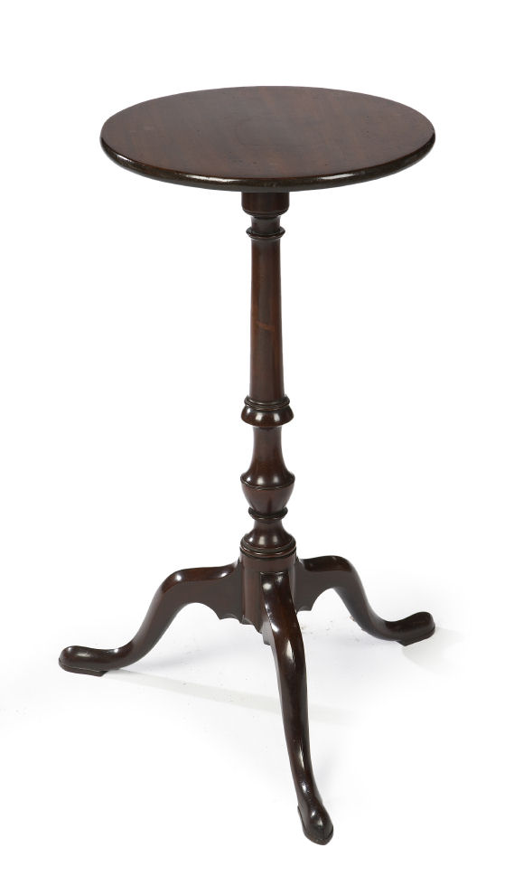 the circular top and turned column support ending on three cabriole legs terminating in pad feet