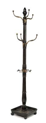 the ring turned twin section stem with lotus leaf cast brass hooks and central stick supports the whole ending in a cast iron square dished base