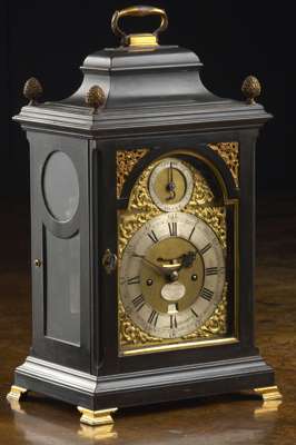 the caddy moulded top above an arched dial with silvered chapter ring and silent / strike, the five pillar twin fusee movement with verge escapement and chiming on a bell