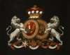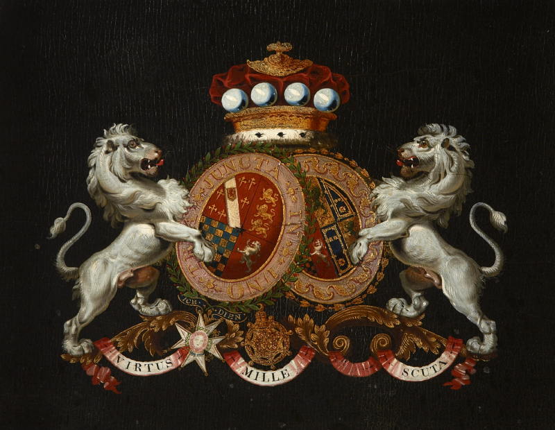 now within a fluted giltwood frame, depicting twin lions holding oval coats of arms below a crown, one bears motto ‘TRA JUNCIA IN UNO’, lower scrolls read ‘VIRTUS MILLE SCUTA’, some restoration and re-painting