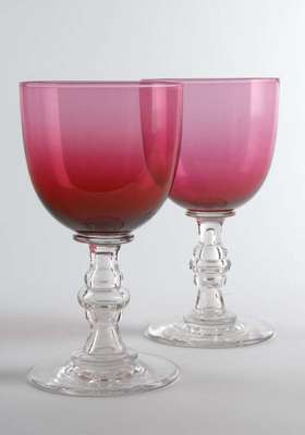 A large pair of early 19th century cranberry glass wine goblets