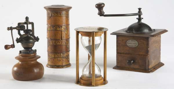 with applied identifying paper labels, 20cm high; together with a French coffee grinder with label ‘JAPY FRERES, BEAUCOURT, PARIS’, a modern grinder and a brass 12 minute sand glass, stamped ‘12 MIN’ (4)