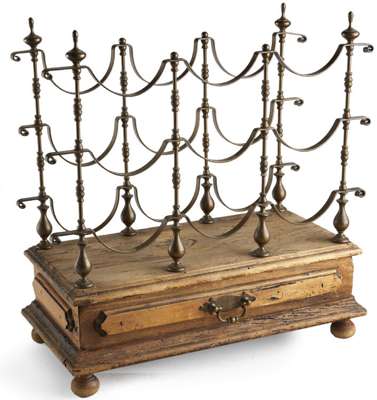 the rectangular base with one drawer, surmounted by a wirework frame, supporting nine bottles
