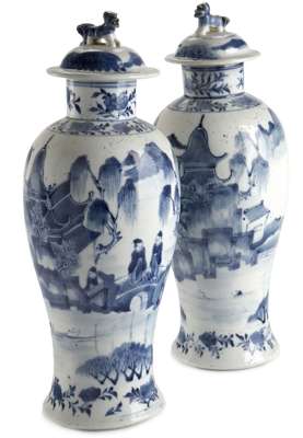 the domed lids with f-lion finials, the baluster sides decorated with figures and pagoda within a continuous landscape (2)