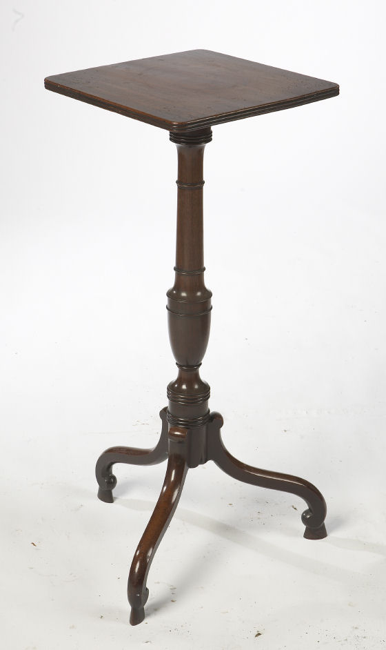 the rounded square top with a reeded edge on an urn and ring turned column with triple downswept legs