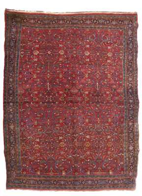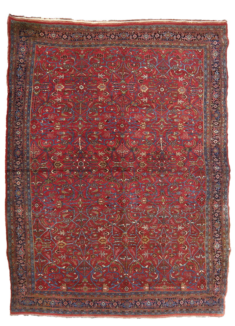 the crimson field with allover palmette, rosette and foliate lattice, within indigo turtle palmette and angular vine border between camel and blue bands