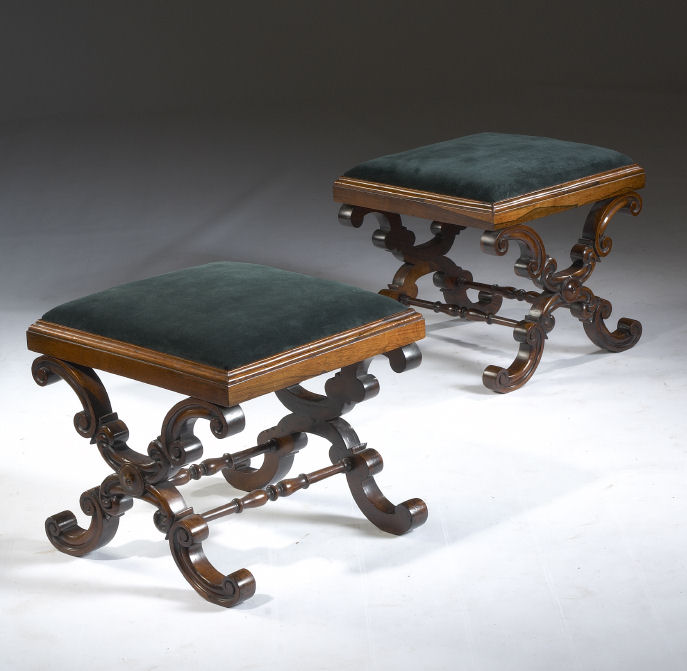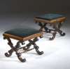 with blue suede upholstered drop in seats, raised on C scroll X-form supports and joined by turned stretchers (2)