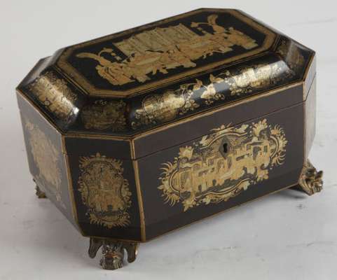of octagonal form, gilt-decorated throughout with panels of various figures in interior and exterior scenes, the hinged lid revealing two decorated lidded lead canisters, on stylised lion mask feet