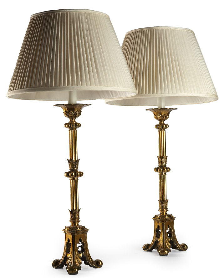 A pair of late Victorian period gilt brass table lamps in the Gothic taste