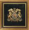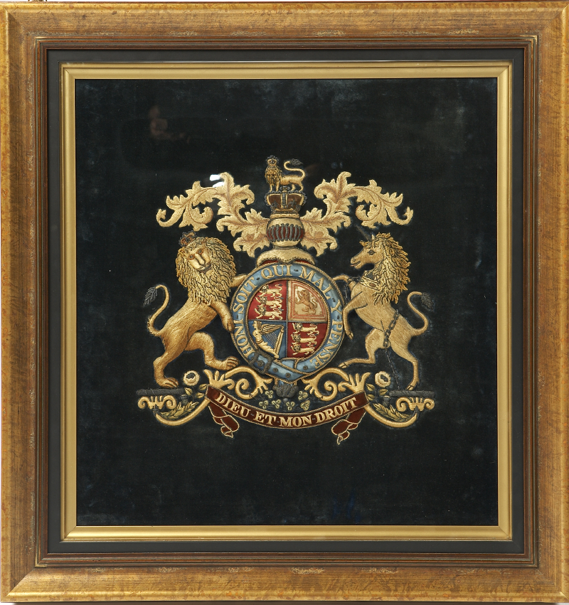 with lion and unicorn upholding the British Royal coat of arms with the motto ‘HONI SOIT QUI MAL Y PENSE’ and ‘DIEU ET MON DROIT’ on a velvet background within a later moulded frame.