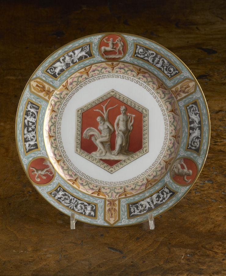 from the Raphael service, commissioned by Alexander III, centrally painted en grisaille with a hexagonal reserve depicting a classical figure, within a panelled border decorated with trompe l’oeil cameos, underside with red / gilt monogram for Nicholas II