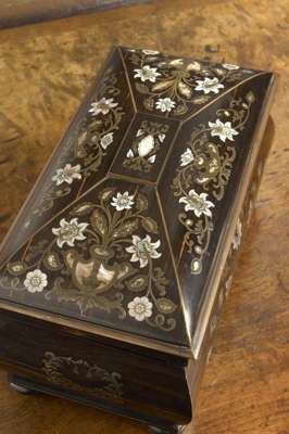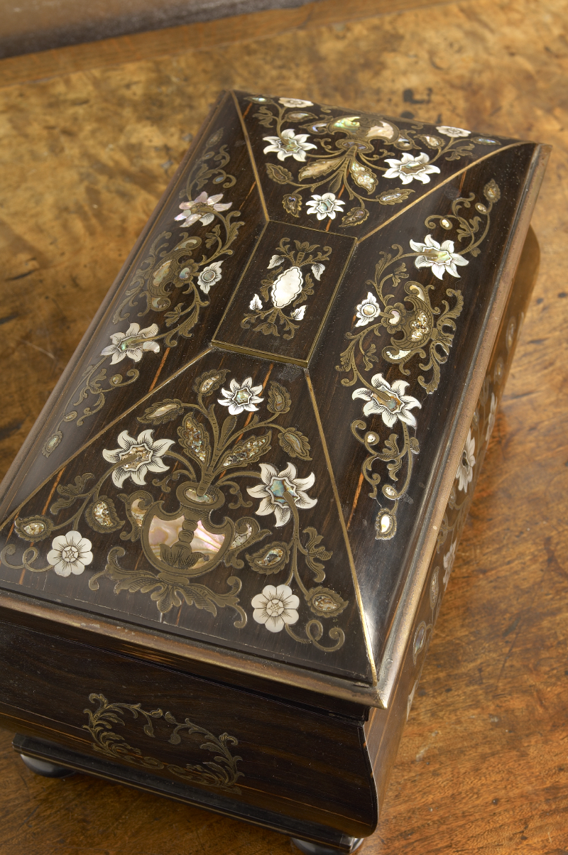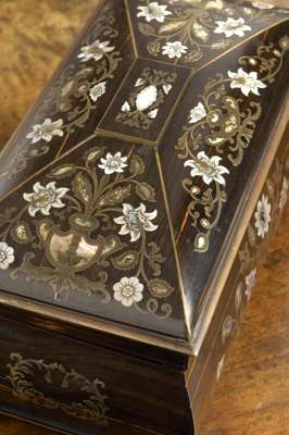 A large Victorian period coromandel, brass and mother of pearl inlaid tea caddy