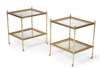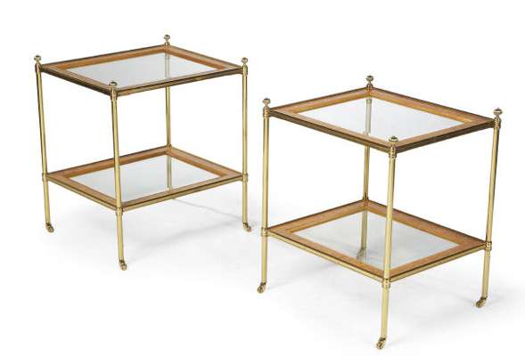 the rectangular tiers with inset glass panels, raised on turned supports with lobed finial and terminating in castors (2)