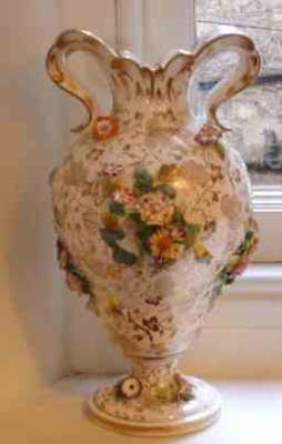 19th century, the ovoid sides with twin naturalistic scroll handles & applied with floral clusters and sprays, against a white gilt enhanced ground, raised on socle bases, blue cross sword marks