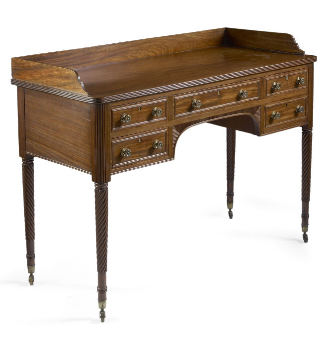 the rounded rectangular top with a solid three quarter gallery, above a central frieze drawer and arched reeded apron, flanked by two further short drawers to either side, raised on spiral reeded legs terminating in brass cappings and casters, possibly Cork