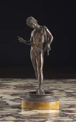 bronze, dark brown patina, raised on a circular base