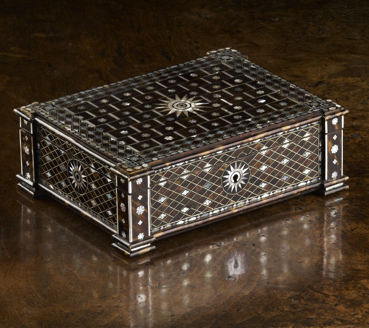 decorated throughout with geometric and stylised foliate motifs, the hinged lid with outset corners enclosing a plush lined interior, raised on bracket feet