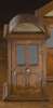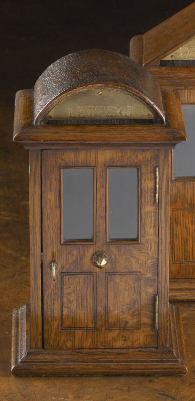 in the form of a sentry box, the arched top with a letter aperture and entitled ‘LETTERS’, below is a glazed panel door enclosing a void interior, raised on a moulded platform base