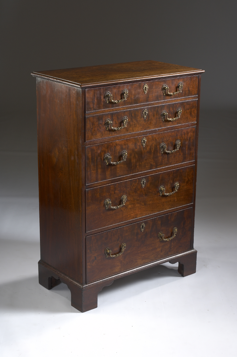 the moulded top over a fall front enclosing a shell and blind fret carved fitted interior with pigeon holes, drawers and a central cupboard door, below are three long graduated drawers, raised on bracket feet