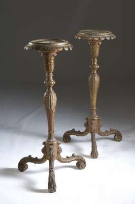 the bead-moulded dished tops with an undulating frieze, with acanthus carved baluster turned column supports, ending on three conforming cabriole scroll legs