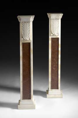 A pair of 19th century Neoclassical style Carrera marble and porphyry pedestals