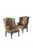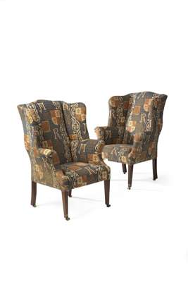 covered in stylised blue heraldic pattern fabric, raised on square tapered legs terminating in brass cappings and castors (2)