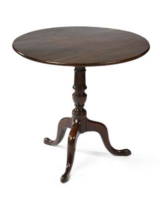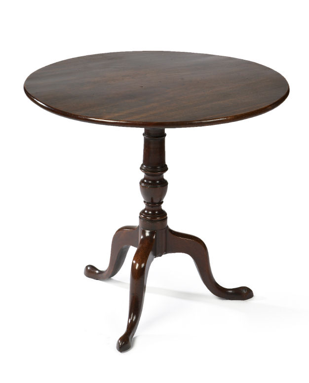the circular tilt top and vase shaped turned column support, raised on three cabriole legs ending in pointed pad feet