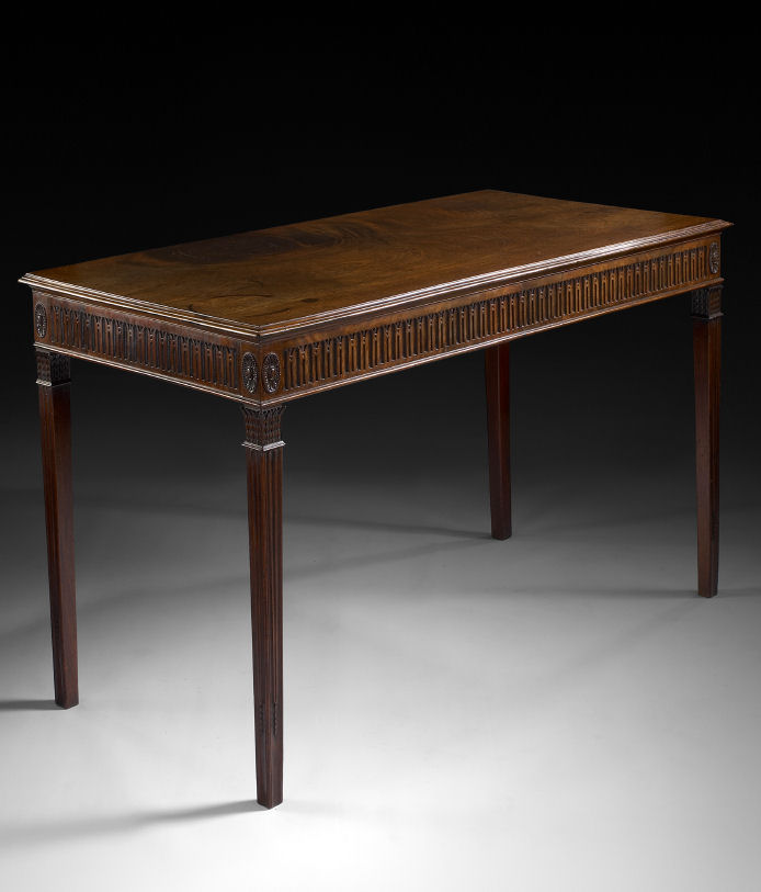 in the Hepplewhite style, the moulded rectangular top above a fluted frieze, raised on fluted square tapered legs surmounted by paterae