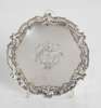 of shaped circular form with engraved central cartouche with crest, ornate pierced and chased border, raised on three scroll feet