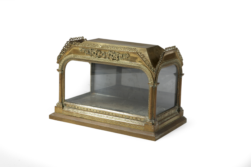 the castellated top above glazed panel sides, flanked and divided by cluster columns, on a plinth base