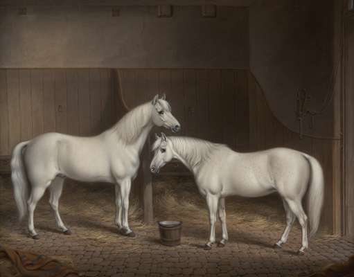 PAIR OF GREY HORSES IN STABLE INTERIOR