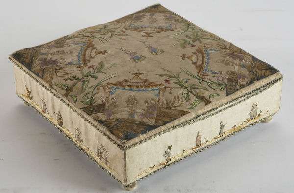 in the Chinese style, decorated throughout with Oriental figures, apgodas and flowering plants, the hinged lid enclosing a plush blue buttoned interior, raised on turned ivory feet