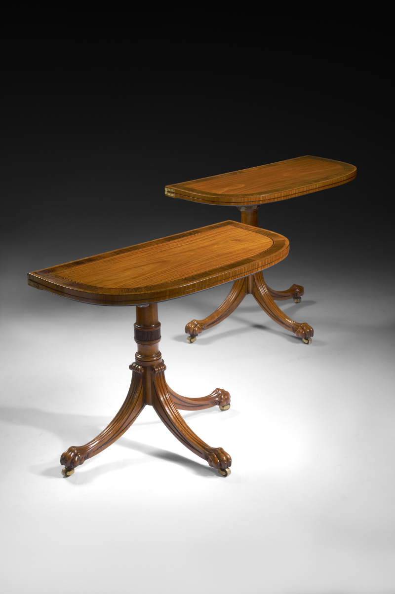 the D-shaped fold over tops supported by gate leg action, opening to reveal an inset baize playing surface and a conforming crossbanded surface, raised on turned a reeded column supports with reeded downswept legs, terminating in carved claw feet and brass castors (2)
