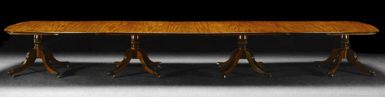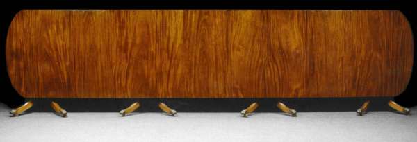 with three leaf insertions, the rounded rectangular top with a reeded edge, on lotus leaf carved column supports ending in reeded downswept legs terminating in brass hairy paw cappings and castors